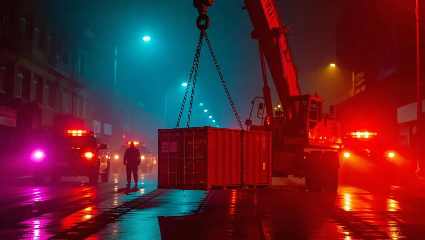 A group of thieves manipulates a crane to lift a crate full of stolen jewelry. Authorities come closer, their sirens reverberating through the air. The scene is washed in the chilly light of moonlight.