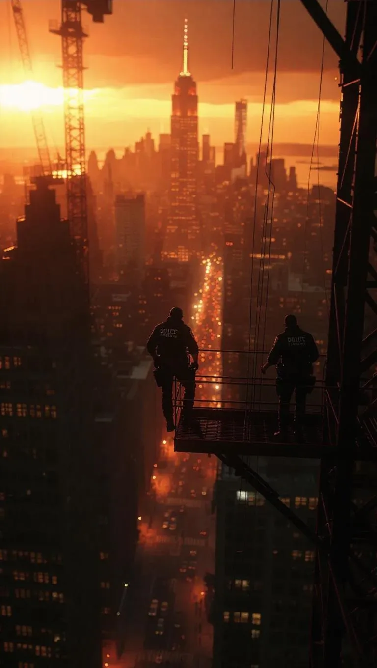 A thief ascends the rigging of a construction zone, dogged by police detectives. The city skyline burns bright in the distance, with cranes and ongoing projects creating a frenetic energy. The moment is captured with wild angles and a hefty, imposing tone.