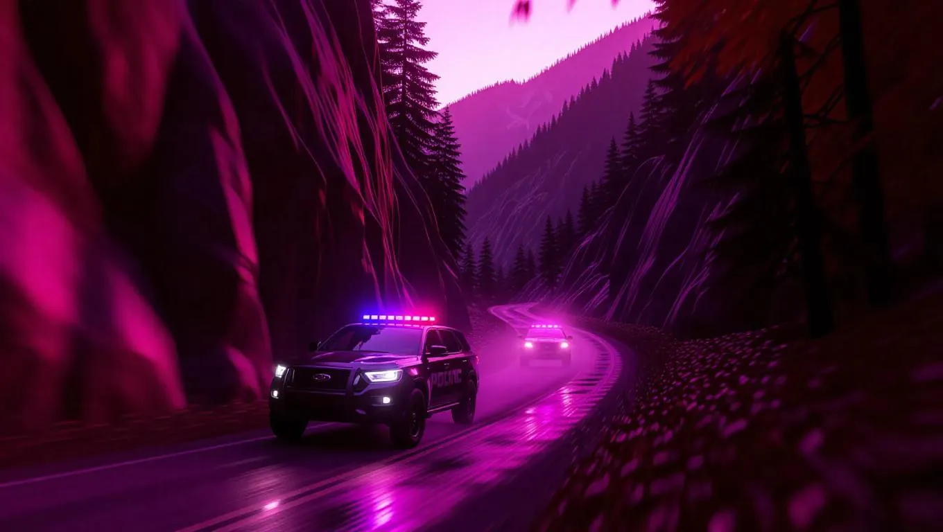 An electric off-road vehicle speeds through a winding mountain road, kicking up leaves and twigs. Police SUVs follow closely, their sirens echoing through the narrow gorge. The scene is framed with dramatic cliffs and a pink twilight, emphasizing the high-stakes escape.