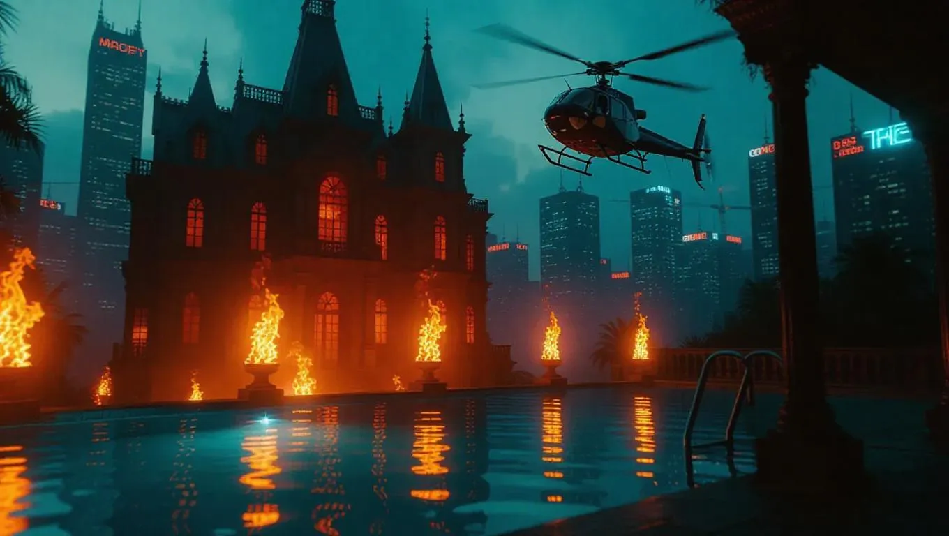 A booby-trapped mansion explodes in a futuristic city, fireballs silhouetting neon signs, as a helicopter escapes into the cyberpunk sky. Infinity pool reflects both fire and digital ads. Epic wide shot with deep layering and orange-teal blockbuster palette.