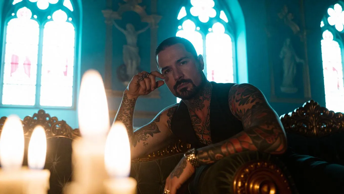 A heavily-tattooed gangster leans against a velvet chaise longue inside a baroque-style church turned hideout, gold candles flickering beside assault rifles and silver relics. A stained-glass Jesus glows behind him, casting fractured color across his face. Moody lighting meets street crime with chiaroscuro styling.