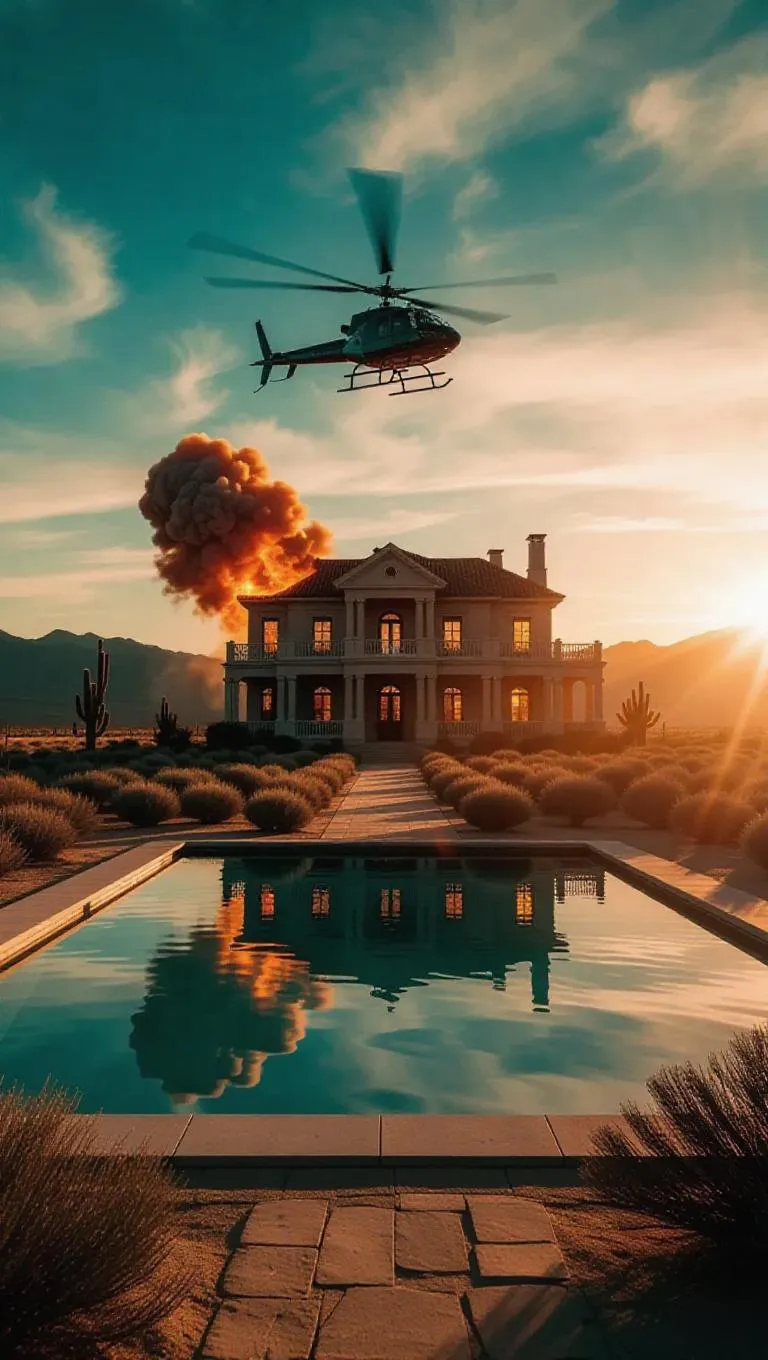 A booby-trapped mansion explodes in the desert, fireballs silhouetting sagebrush, as a helicopter escapes into the golden sky. Infinity pool reflects both fire and the sun. Epic wide shot with deep layering and orange-teal blockbuster palette.