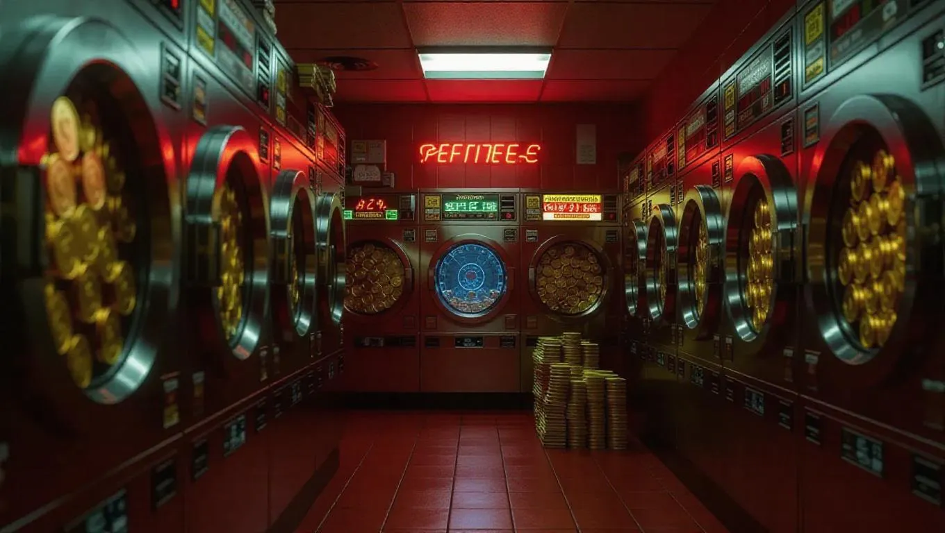 An undercover money laundering area in a retro laundromat, where dryer doors spin with gold coins instead of clothes. Criminals count stacks of cash alongside soap and nostalgic arcade games. Surreal realism with warm color grading.