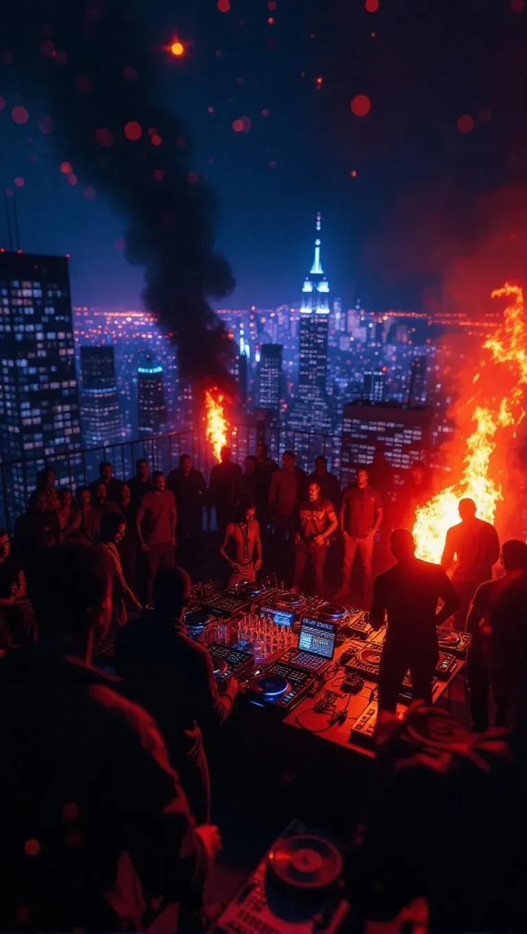 A lavish rooftop party erupts into chaos as rival gangs clash over a high-stakes cybercrime. The city skyline twinkles with stars, with flames shooting high into the air. The scene is captured with a cosmic, high-contrast tone, emphasizing the tension and excitement.