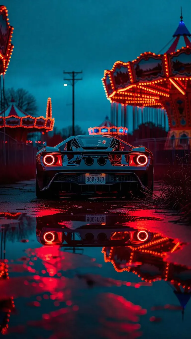 A stolen supercar accelerates through an abandoned amusement park, its undercarriage reflecting colorful remnants of old rides. Red and blue lights flicker on the vehicle's chassis, mirrored by faded attractions around. Nearby, weeds grow through cracked pathways while memories of laughter linger in the air. The atmosphere meanders between nostalgia and adventure, captured in haunting angles, dusky light, and stillness evoking speed through forgotten joy.