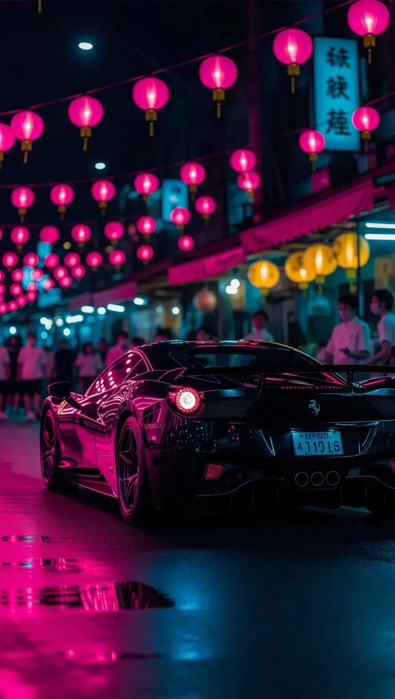 A stolen supercar races through a night market, its undercarriage glowing as it passes by lanterns strung overhead. Pink and gold reflections brighten the vehicle's body, mirrored in excited faces at food stalls. Nearby chefs cook with flamboyant flair, while live music weaves through the air. The vibe is filled with enthusiasm and flavors, captured in lively shots, soft lighting, and vibrant culinary scenes suggesting speed through culture.