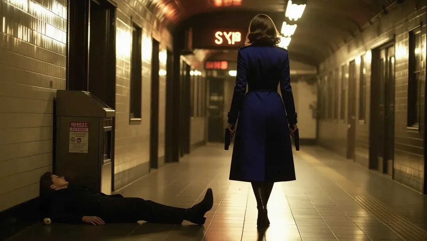 An enigmatic femme fatale clad in a sapphire trench coat strides through a quiet subway station, heels echoing on the tiles, gun in hand. A flickering light overhead illuminates a fallen figure beside a broken ticket kiosk. Film noir themes, high contrast, muted colors.