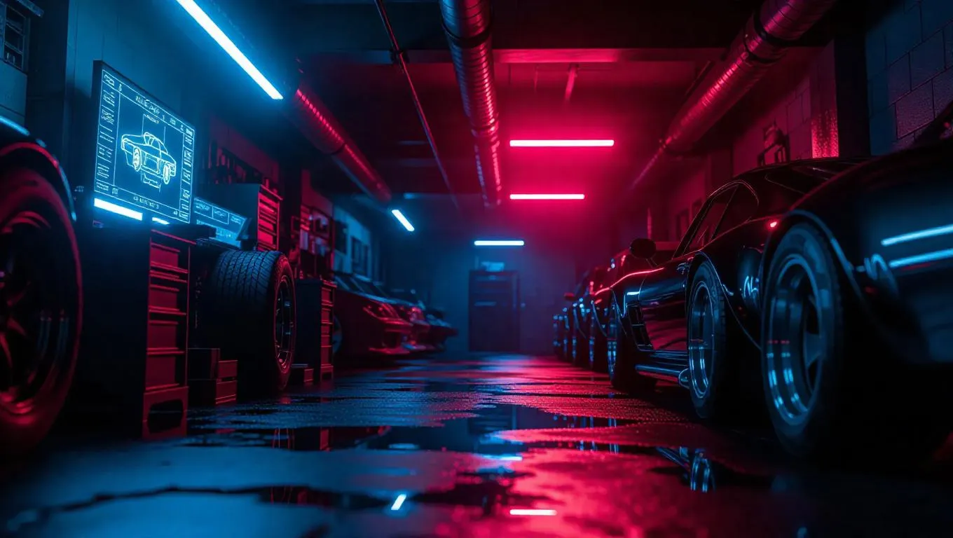 An alleyway garage crackles with welding sparks, where racing cars are rebuilt for the underground circuit. Holographic blueprints flicker on faded screens, and chrome glints under dim red lights. Gritty cyber-crime aesthetic with oily reflections and heat distortion.