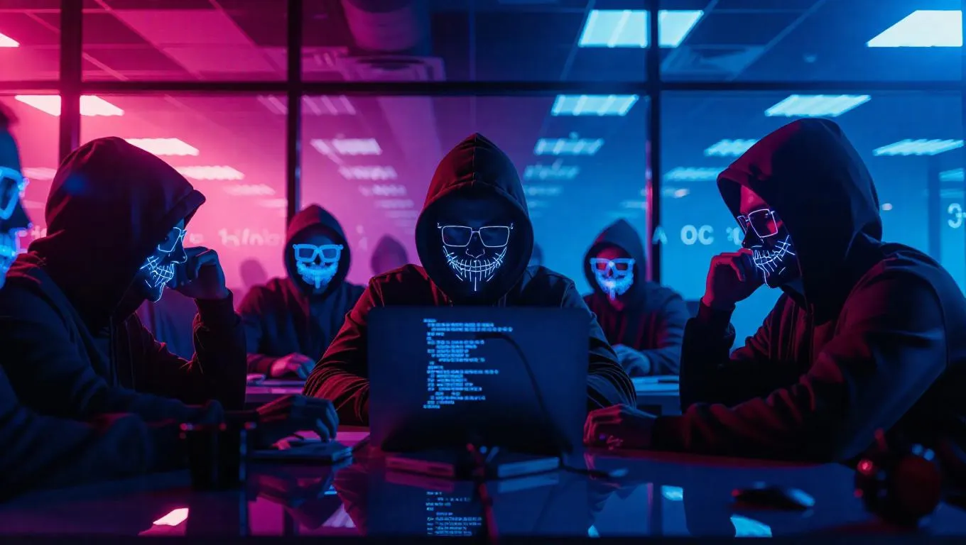 A group of hackers in a modern office surrounded by glass walls and desktops, uploading a virus as corporate logos reflect code across their faces. Corporate cyber-thriller vibe with bright lighting and sterile focus.