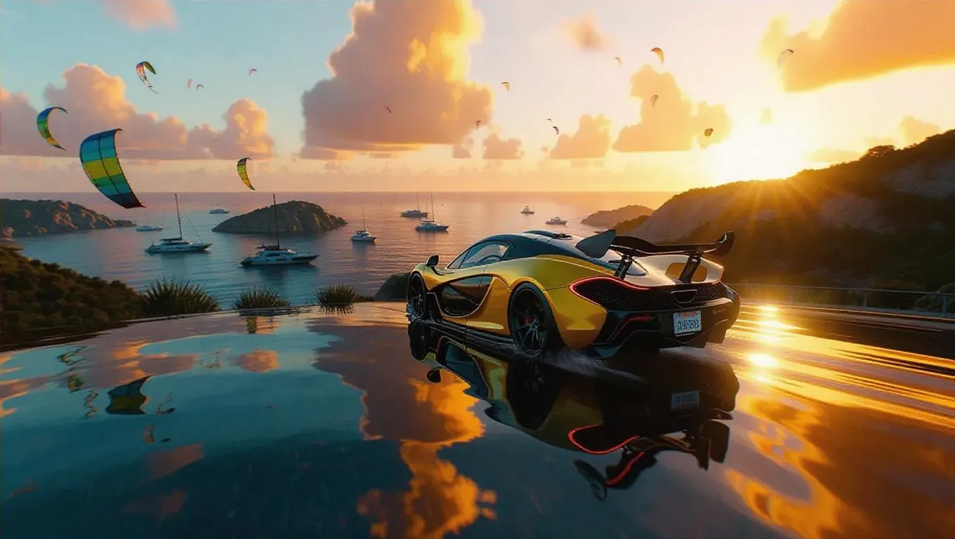 A stolen supercar ascends a hill overlooking the bay, its rear end catching the golden rays of the setting sun. Yellow and orange reflections shimmer on the vehicle’s polished surface, mirrored in the glassy waters below. Nearby, boats bob on the waves, while colorful kites flutter in the breeze against an azure sky. The scene is charged with anticipation and thrill, captured in panoramic views, soft glows from sunset, and dynamic cloud formations hinting at movement through nature.