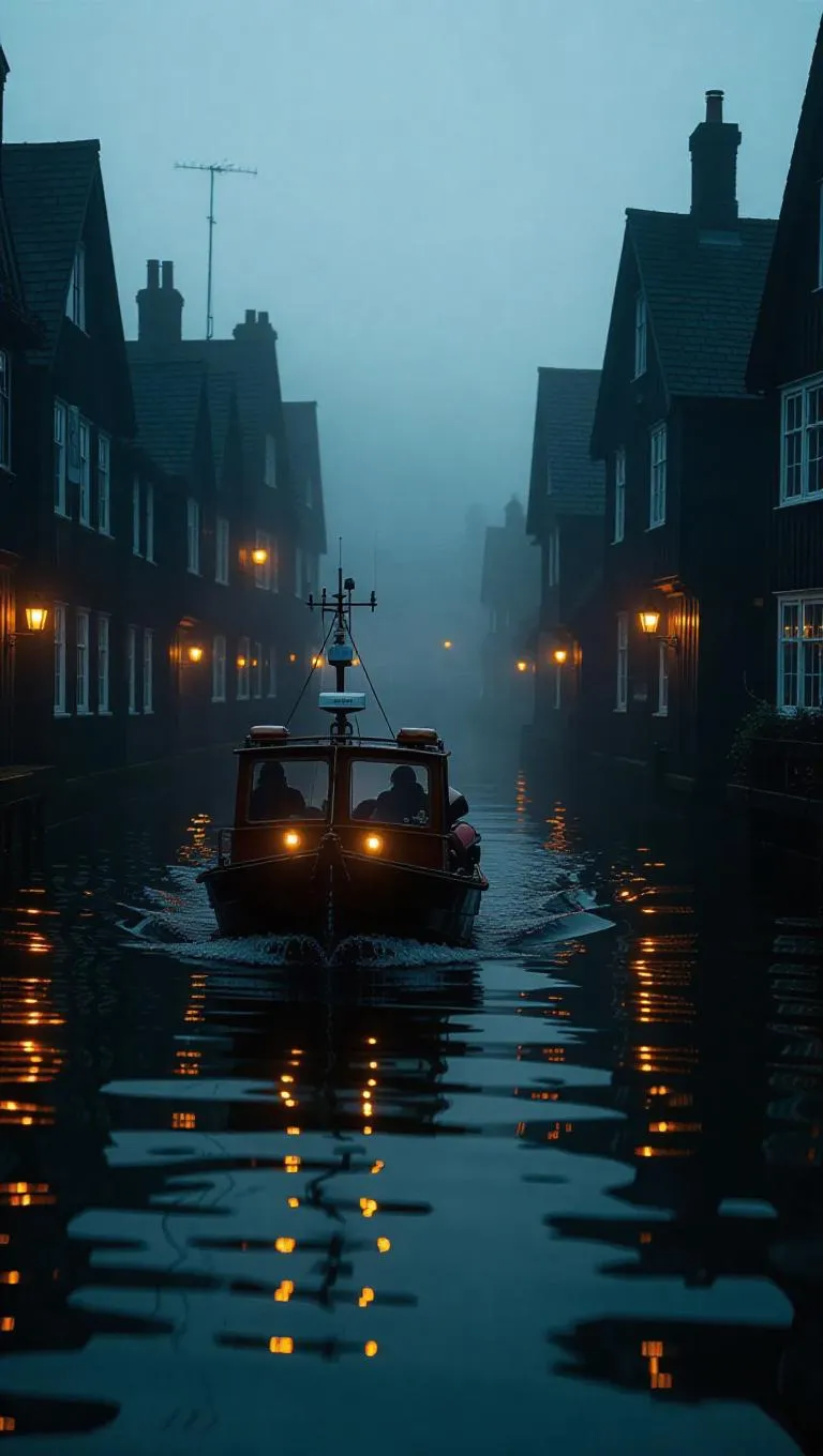 A getaway boat speeds through a misty coastal town, its crew narrowly avoiding police patrols. The scene is illuminated by the flickering glow of candles and the chilly fog of the harbor.