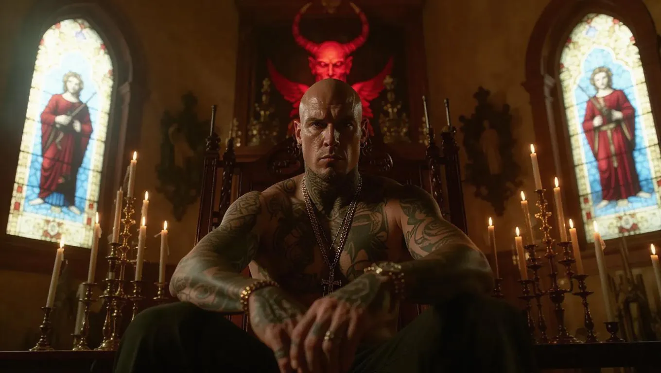 A heavily-tattooed gangster sits on a wooden chair inside a minimalist-style church turned hideout, gold candles flickering beside assault rifles and vintage artifacts. A stained-glass devil glows behind him, casting fractured color across his face. Baroque lighting meets street crime with chiaroscuro styling.