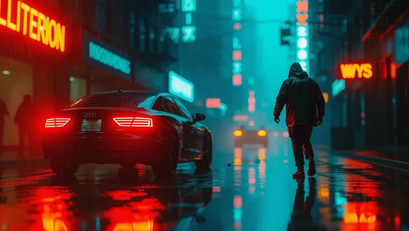 A neon-lit alley pulses with glitchy blurs of orange and teal as a daring thief hotwires an SUV, his face partially hidden, fingers tapping coding scripts in the air. Blinking raindrops create a rhythmic symphony on the pavement as computer-generated warnings strobe overhead. Futurist noir composition with blurry reflections and focused highlights.