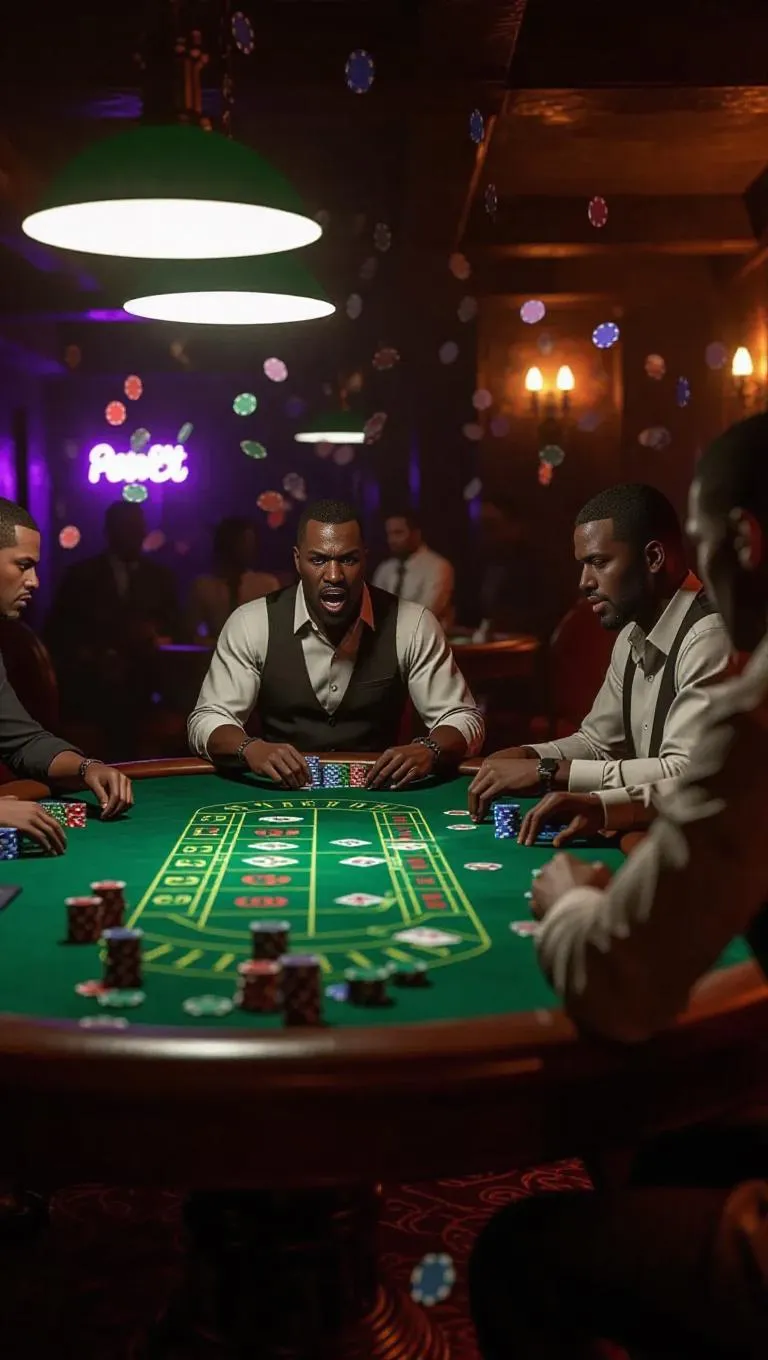In a dimly-lit underground casino in Liberty City, a tense high-stakes poker game is abruptly interrupted by a sudden competitor shouting. Tables overturn, players scatter, and chips fly, the room erupting into chaos as they prepare to defend their stakes.