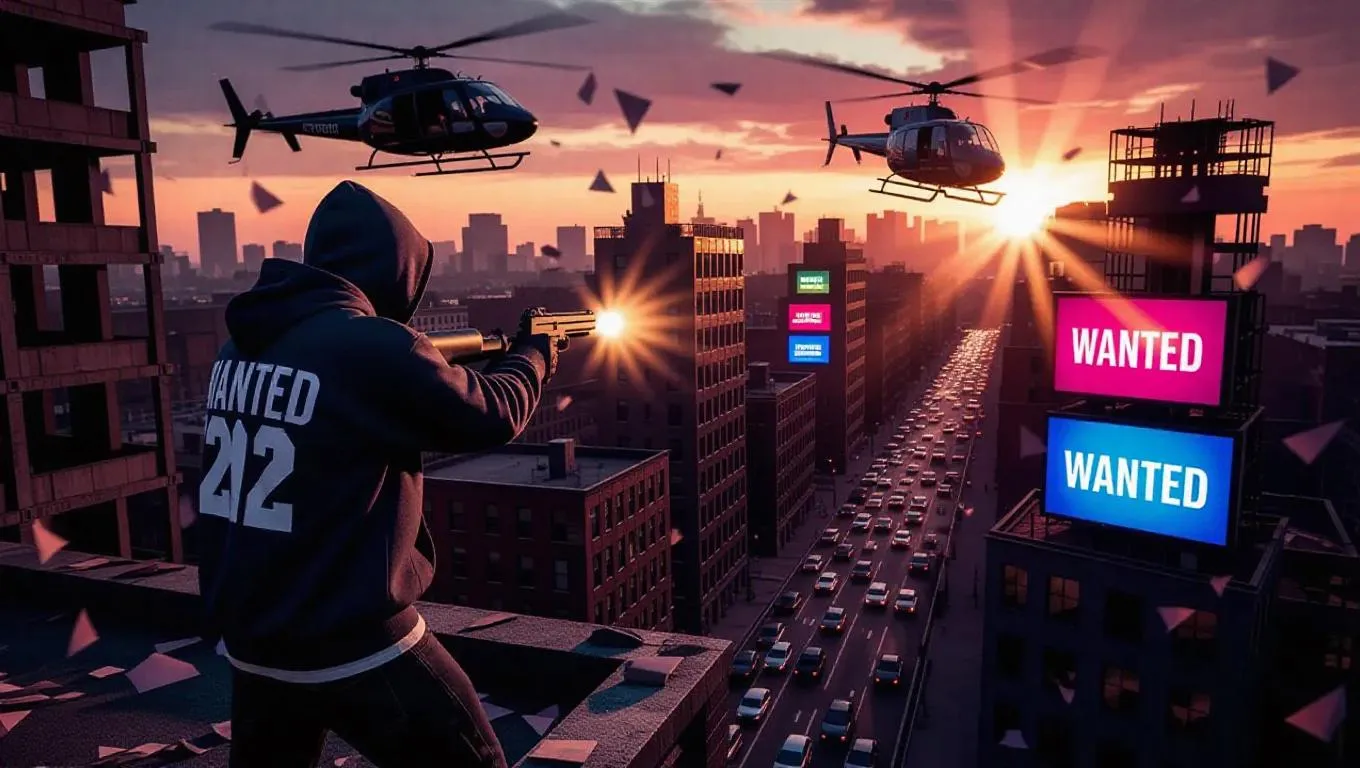 A rooftop standoff unfolds at sunset atop a crumbling tower block, where a lone gangster in an oversized hoodie levels a pistol at encroaching SWAT units. Helicopter rotors churn the colorful dusk, sending paper debris and dust spiraling across the skyline. Below, traffic snarls in a vibrant sea of headlights, while digital billboards flash “WANTED” warnings in vivid contrasts. Tension crackles in the haze, accentuated by sun flares slicing between rusty structures and flashing lights. Dynamic third-person composition, chiaroscuro contrasts with energetic tones.
