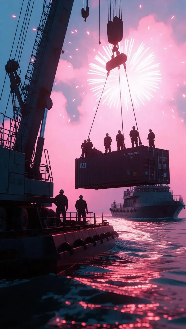 A squad of thieves operates a crane to hoist a container filled with electronics. Navy boats come through, their alarms clashing with the water sounds. The scene glows with the dancing light of distant fireworks.