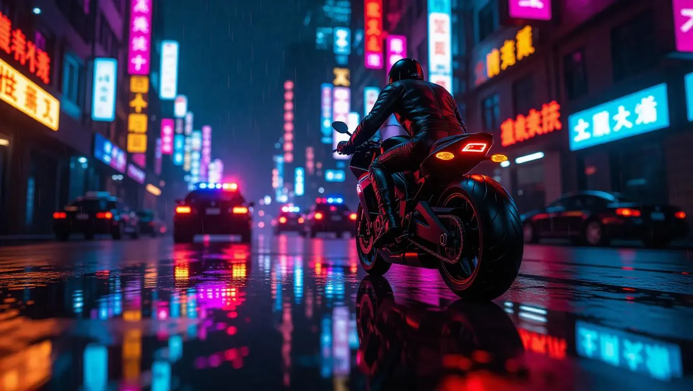 A lone motorcyclist in a black leather jacket darts down a rainy street, backlit by colorful neon lights and flickering signs. Digital reflections shimmer across puddles, and behind him, a chain of patrol cars twist through city shadows. Motion-capture angle from below, sparks trailing from the tailpipe, dramatic shallow depth of field.
