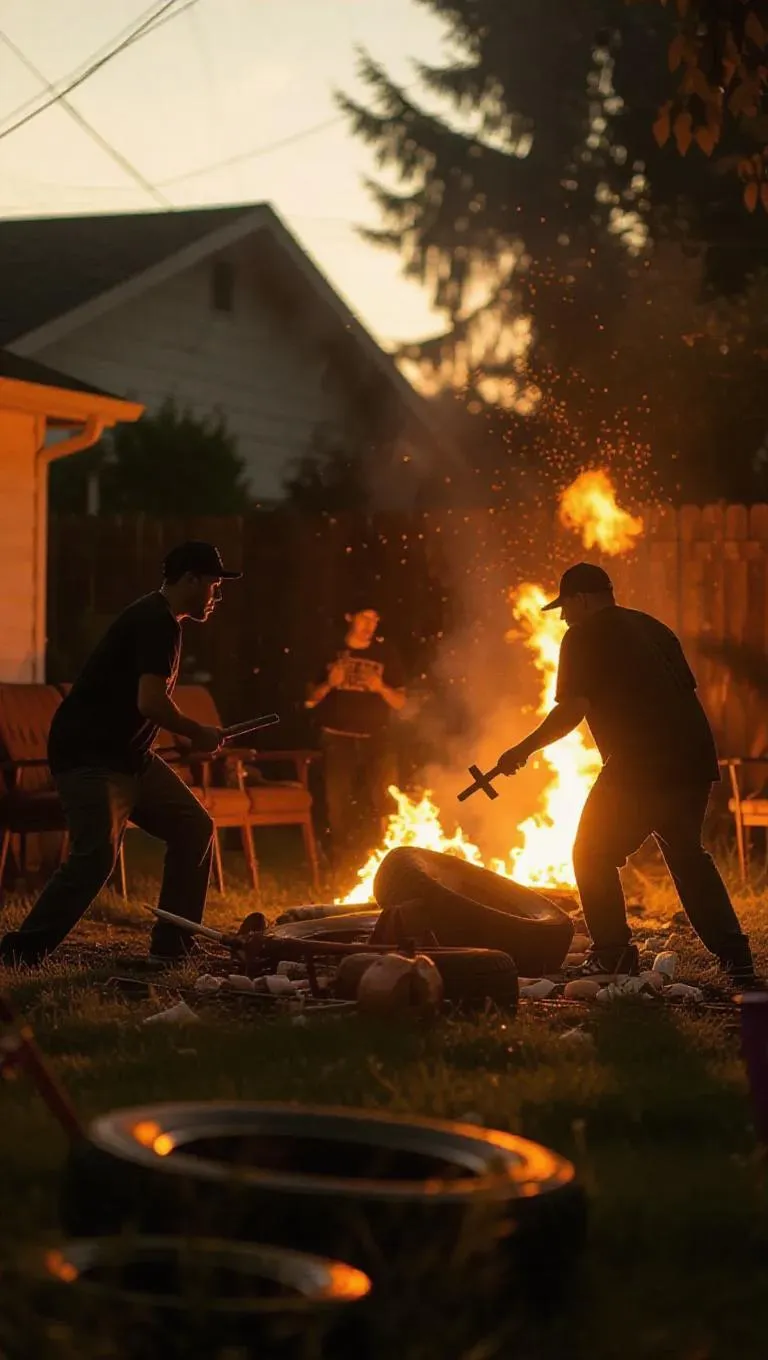 Two rival gangs clash in a suburban backyard, using garden tools and lawn furniture as weapons, the scene illuminated by the warm, flickering glow of burning tires, creating a chaotic, gritty, and intense atmosphere.