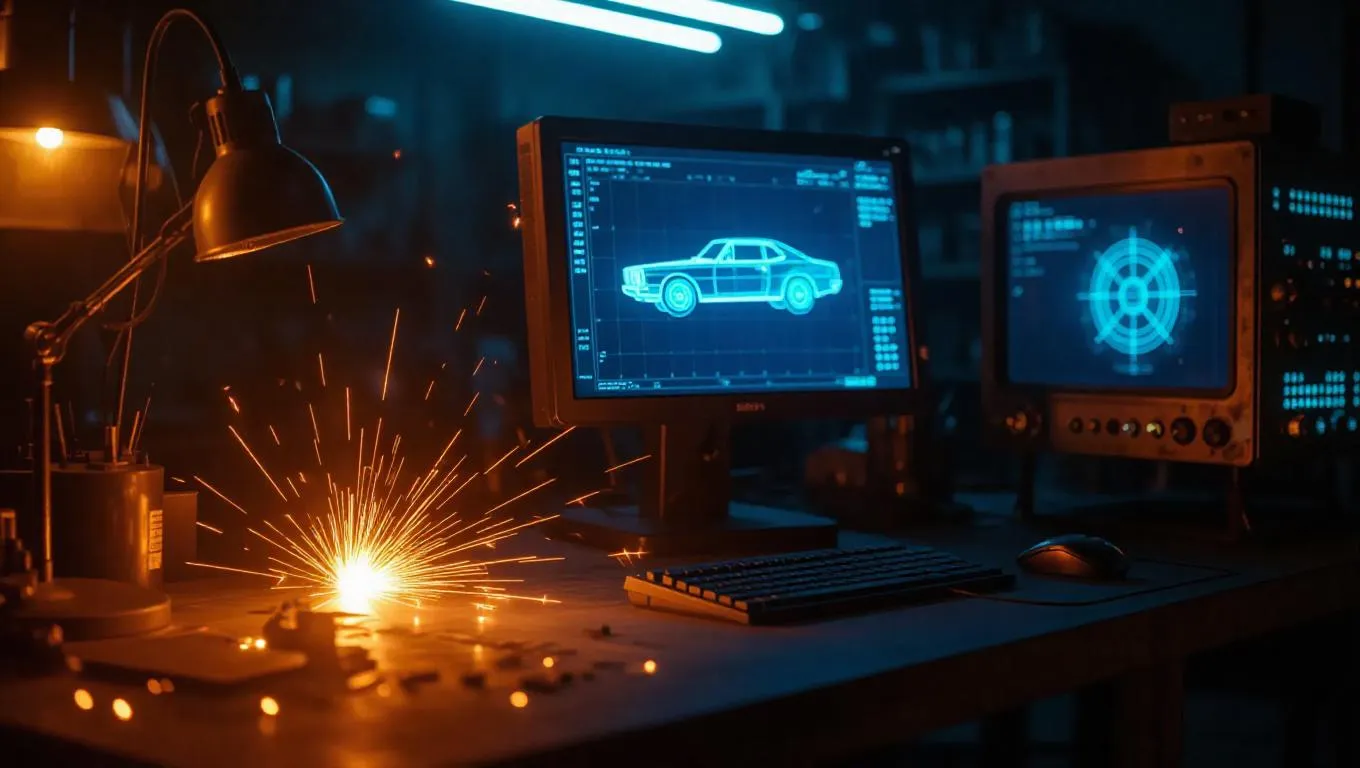 A dim-lit workshop crackles with welding sparks, where beloved classics are rebuilt for collectors. Holographic blueprints flicker on rusty screens, and chrome shines under soft yellow light. Gritty cyber-crime aesthetic with oily reflections and heat distortion.