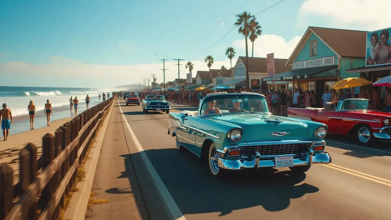 An old-school convertible cruises by a crowded coastal road at midday, with surfers catching waves in the background. Posters of beach legends hang on the shacks, while surf music and cheers rise in the air. Crisp tones with sunny color grading and lens flares.