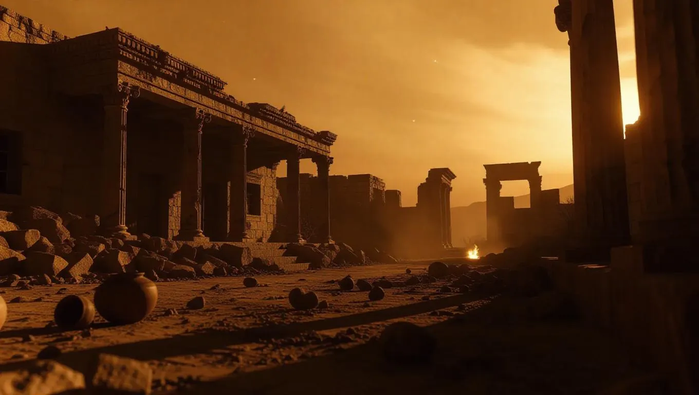 A crumbling motel near an ancient ruin glows under starlight, as a drug deal goes wrong, gunfire erupting between stone pillars and broken pottery. An eerie breeze begins to creep in from the horizon, swallowing the silence. Ancient color palette with historical lens and ambient shadows.
