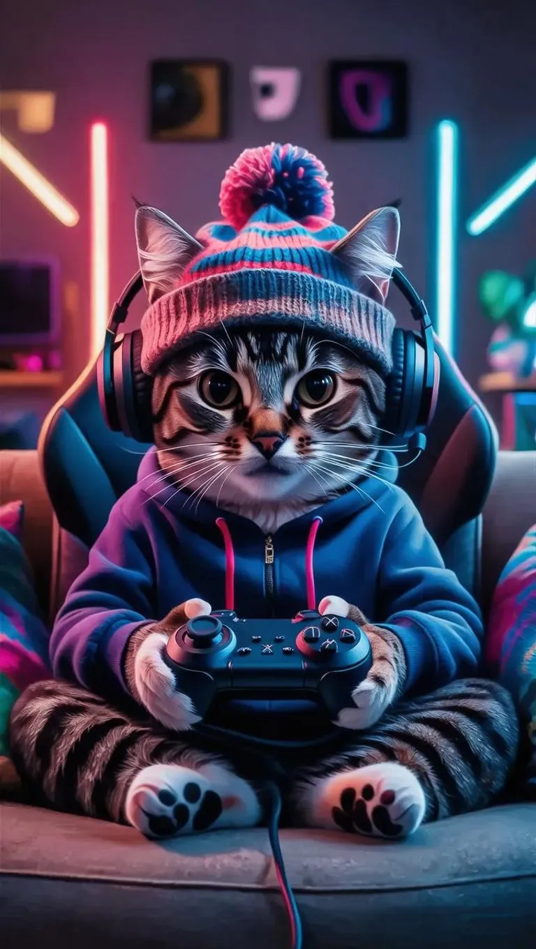 Create an AI-generated image of an anthropomorphic gamer cat with detailed fur, wearing a beanie and headset, holding a controller in a neon-lit gaming setup. Vibrant swirling colors, LED accents, and fluorescent lighting highlight this playful feline scene. Perfect for AI art lovers. Powered by vivago.ai's advanced image generator and creative effects tools.