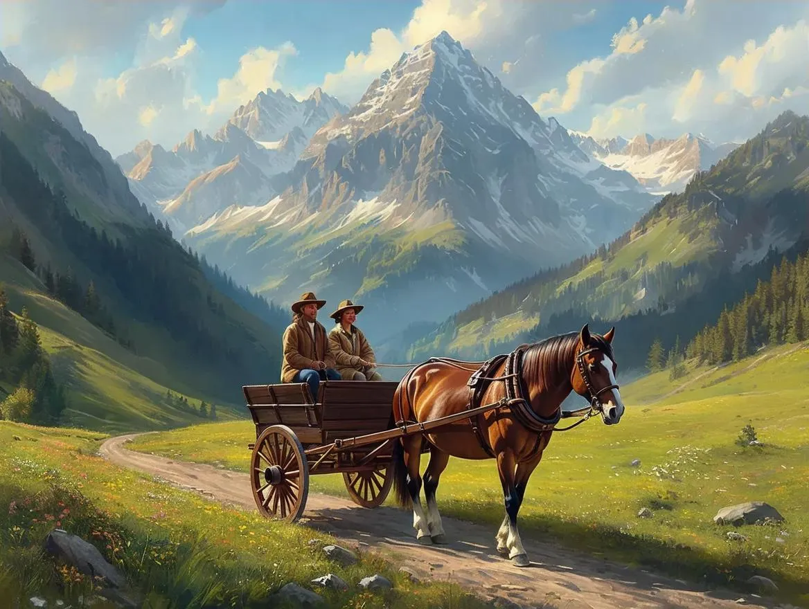 Generate a serene mountain landscape with two people in a horse-drawn cart using AI. Transform text into vivid visuals with Viavgo.ai's creative tools for professional-grade images and videos.
