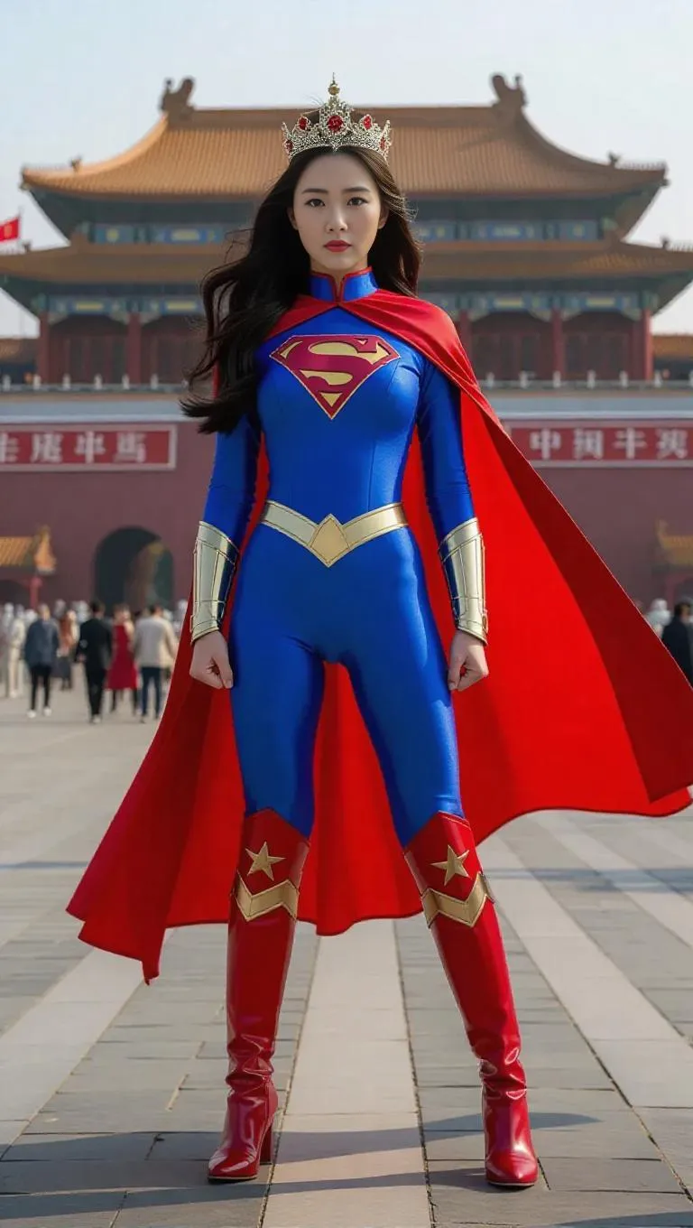 Generate a 4K HDR AI image of Chinese Super Girl Queen Hong Xing in a patriotic red/blue star-emblazoned superhero uniform, flowing cape, crown, and boots. Full-body dynamic shot highlights heroic stance and intricate costume details against a bold Beijing backdrop. Powered by vivago.ai for cinematic AI artistry.