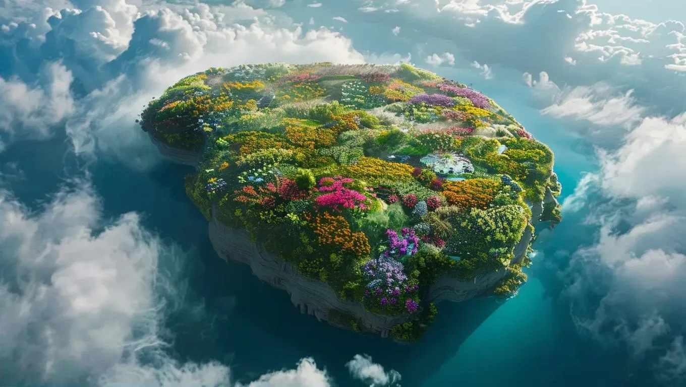 Capture a surreal aerial view of a floating island shaped like a sleeping giant, blooming with diverse ecosystems—deserts greening and frozen peaks sprouting alpine meadows. Enhanced with Super Clarity and V-Ray effects, this drone-captured scene features overexposed highlights, dreamlike haze, and ethereal clouds for a mystical Bird's Eye View masterpiece.