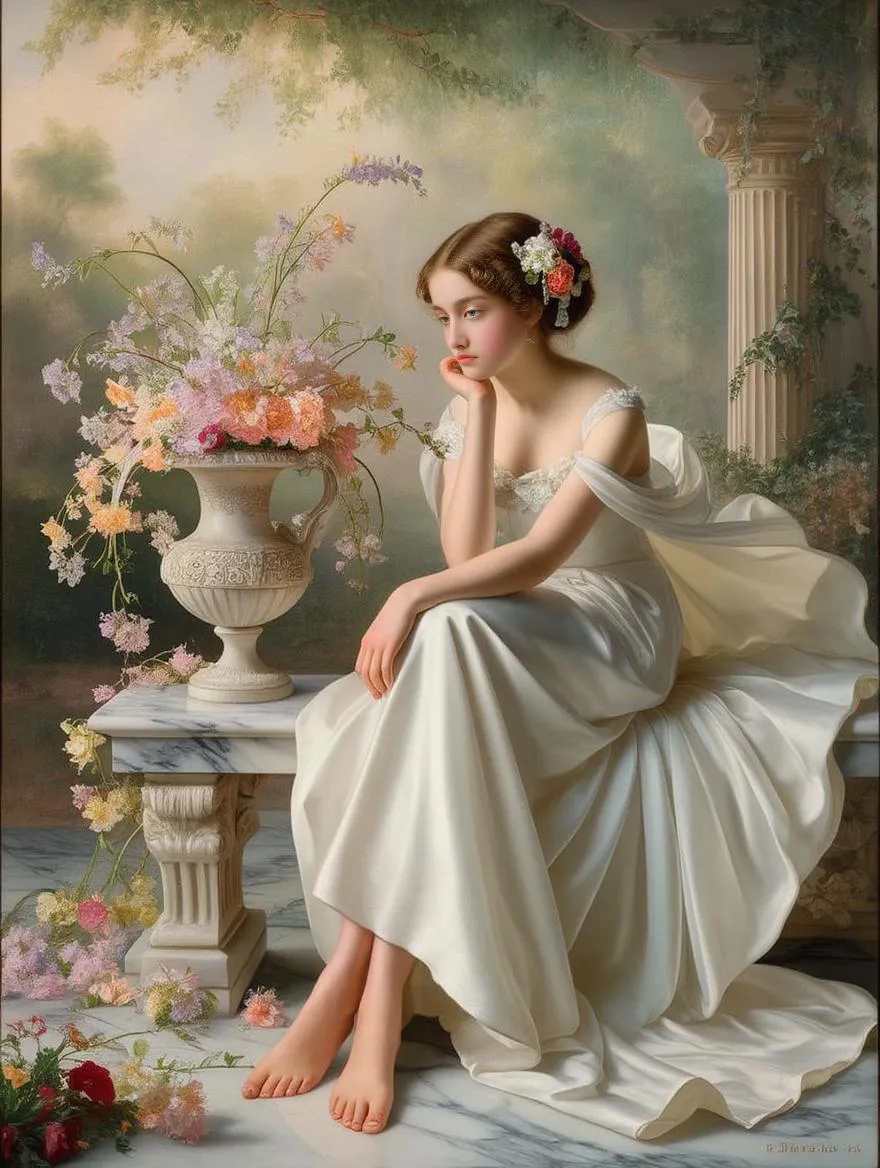 Generate classical oil paintings with Pre-Raphaelite influence using AI. Craft romantic pastoral scenes featuring Greek-inspired settings, muted palettes, and 19th-century aesthetics. Ideal for evocative, highly detailed AI-generated art with masterful brushwork, delicate details, and soft natural lighting.