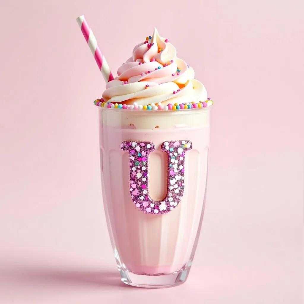 super beautifull and delisius looking milkshake , pastel colors with stra and glitter stripes , with the U brand letter