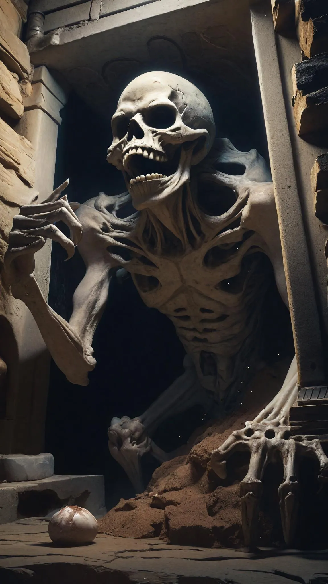 Hyperrealistic 4D depiction of Gashadokuro yokai emerging from ancient tomb ruins, skeletal claws tearing stone in eerie, dim light. Ultra-detailed AI art brings Japanese folklore to life with dusty decay, haunting contrasts, and chilling realism. Create captivating, terror-inducing scenes inspired by mythology using vivago.ai's advanced AI image generation and effects tools for professional-grade visuals.