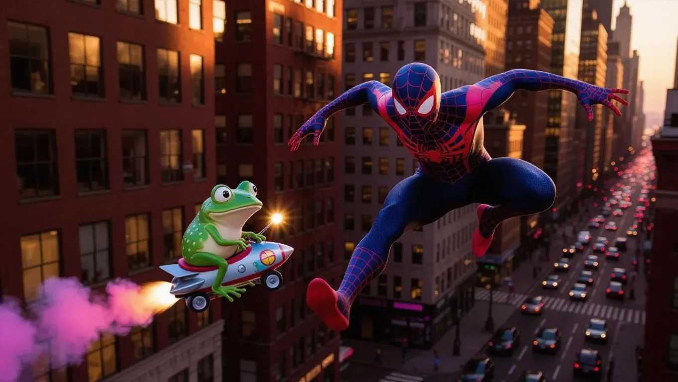 “A spider-suited superhero swings between skyscrapers in a realistic New York City at sunset, chasing a bizarre cartoon frog on a tiny rocket scooter. The frog looks back mischievously as it speeds through traffic, leaving a trail of neon smoke. Cinematic golden-hour lighting, dynamic urban detail, wide-angle city view, camera tracks both characters from above in a fast-paced motion shot.” ⸻ ???? Recommended Settings for Vivago.ai:    •   Aspect Ratio: Horizontal (16:9) for full urban spread.    •   Motion Strength: High (for chase and swinging).    •   Style: Mixed — Realistic city + stylized creature (cartoonish frog)
