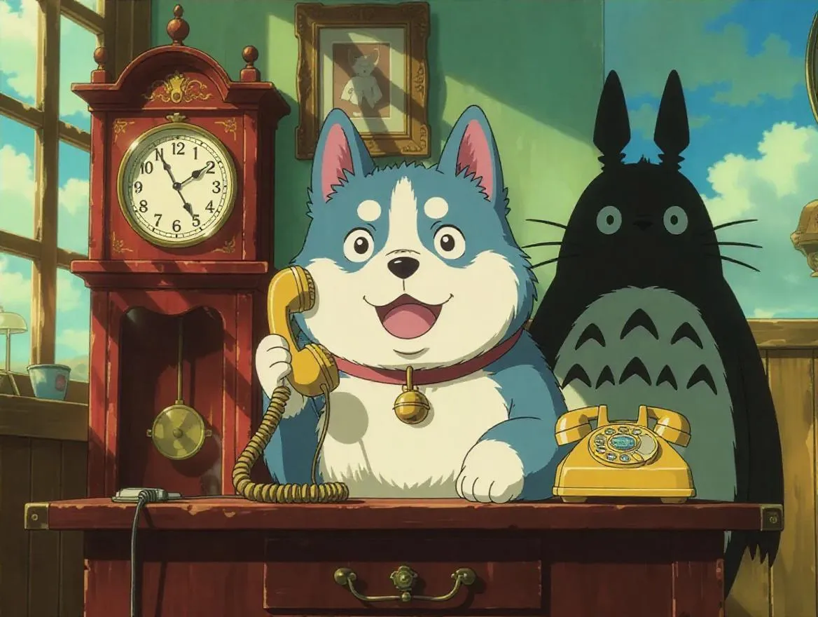 Create enchanting Studio Ghibli-style anime art with a cute, wide-eyed anthropomorphic dog at a vintage wooden table, holding a retro yellow telephone. Features a whimsical grandfather clock, shadowy mannequin figure, soft pastel colors, and gentle lighting. Perfect Totoro-inspired kawaii charm for heartwarming Ghibli illustrations and anime cartoon designs.