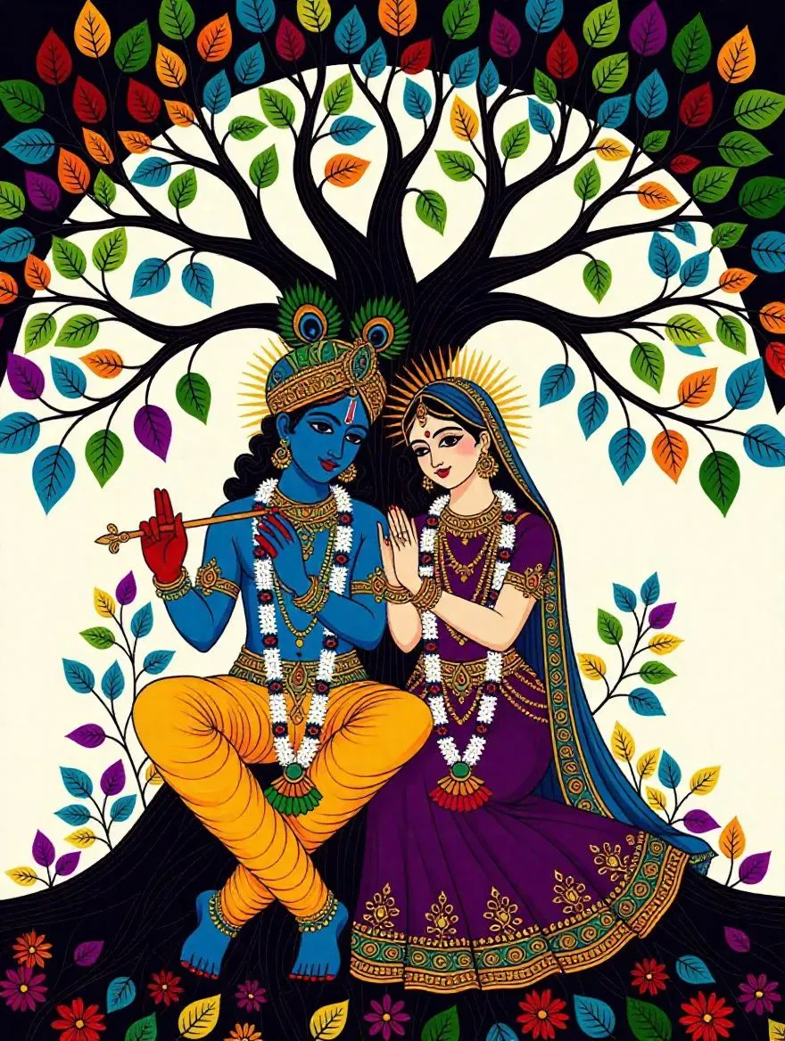 Madhubani art style, intricate and mesmerizing ink design featuring Lord Krishna and Radha in a sacred fig tree, evoking a dreamy, poetic atmosphere. Fantasy art with vivid colors: blue, green, yellow, purple, red. Maximum detail, black pearl background, ethereal glow.