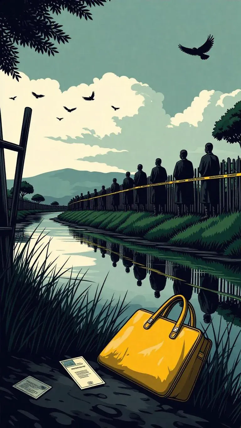 Craft haunting AI-generated 2D cartoon illustrations of a rural South African village's cinematic landscape. High-detail scene features an abandoned yellow handbag, police tape, solemn locals, and distant vultures under overcast skies. Dark-themed, safe imagery with a sad tone for evocative storytelling and immersive visual narratives.