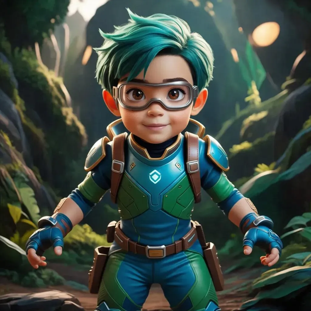 Zephyr, the Agile Explorer: AI-generated young adventurer with teal hair and high-tech gear, embodying speed and stealth to navigate treacherous landscapes. Craft dynamic visuals of this relic-seeking guardian using vivago.ai's AI tools for creative storytelling and nature-inspired character design.