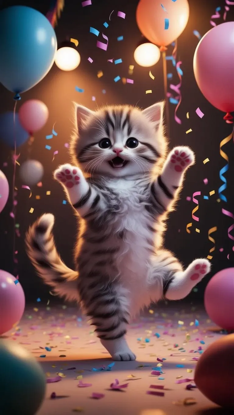 Create vibrant AI-generated visuals of a photorealistic kitten dancing joyfully in a festive 4K scene. Experience surreal minimalism with vivid color contrasts, dramatic lighting, and rich details—confetti, balloons, and warm lights enhance this heartwarming, lively atmosphere. Perfect for experimental art styles using advanced AI tools.