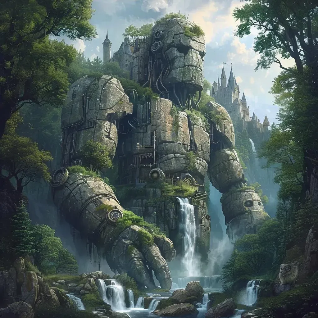 Discover a hyperrealistic panorama of a mystic fantasy magical forest, where a colossal stone giant's corpse becomes an underground city teeming with life. Lush ecosystems thrive amidst gurgling streams and medieval castle remnants, blending steampunk elements with ink painting aesthetics. This game-style scene captures a surreal, full-length shot of nature reclaiming ancient relics in a captivating mystic fantasy world.
