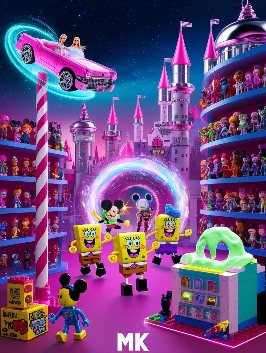 A neon-drenched toy metropolis under a starry sky, fusing enchanted castle spires with retro-futuristic chrome domes. Barbie’s levitating convertible spins atop a candy-cane pillar, while graffiti-covered Bratz bots dance beneath holographic slime-pop lightshows. Towering shelves crammed with glitchy action figures frame Buzz Lightyear leading a luminous toy parade toward a swirling portal. Close-up: a sentient LEGO brick with Mickey ears winks beside SpongeBob’s slime-oozing cash register, rendered in hyper-detailed 8K with prismatic light refracting through crystalline swords. Hidden gems—WALL-E clutching a lamp, Mona Lisa graffiti—dot the landscape. Cinematic lighting bathes this gravity-defying wonderland, where plush aliens, levitating carousels, and molten-lava pools collide in explosive nostalgia-futurism.