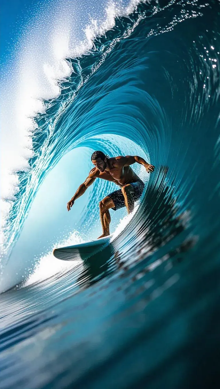 Generate ultra-realistic AI visuals of a surfer riding a massive ocean wave with vivid details: glossy surfboard, glistening water droplets, and dynamic blue waves. Transform prompts into high-definition, saturated scenes using vivago.ai's AI image tools for professional-grade action shots and lifelike water effects.