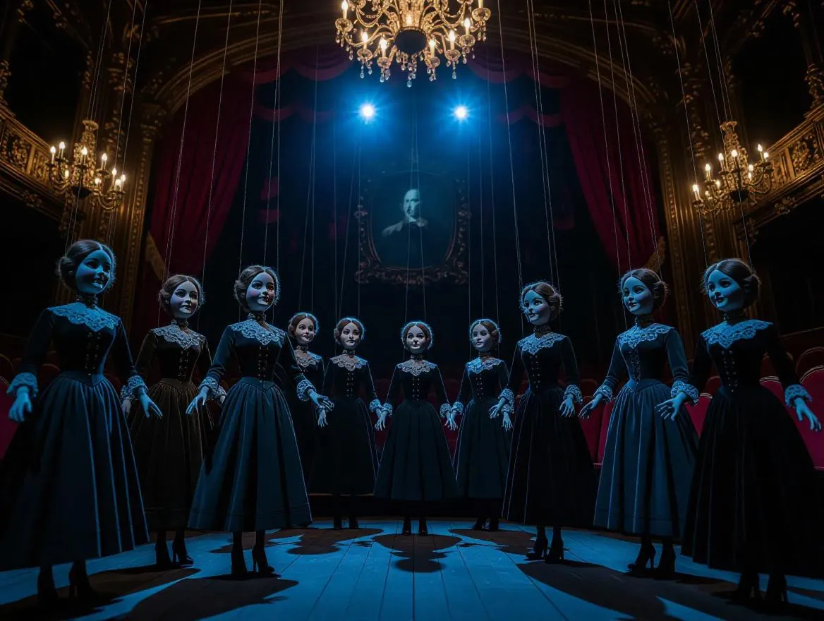 A moonlit derelict opera house filled with weathered marionettes frozen mid-performance. Elaborate puppets with ivory-carved faces, cracked jeweled eyes, and tattered velvet robes hang from tarnished silver strings, limbs contorted in tragic poses. Pale blue light spills through shattered stained glass, casting kaleidoscopic shadows across rotting velvet seats and a stage littered with broken music boxes. A spectral puppetmaster's faded portrait glows faintly above the proscenium, hollow eyes controlling the dance as cobweb-covered chandeliers sway silently. Ultra-detailed textures: moth-wing lace collars, oxidized copper joints, and clockwork hearts visible through cracked chests. Cinematic low-angle framing emphasizing towering marionettes against arched ceilings, cold moonlight blending with flickering candle remnants for haunting chiaroscuro.