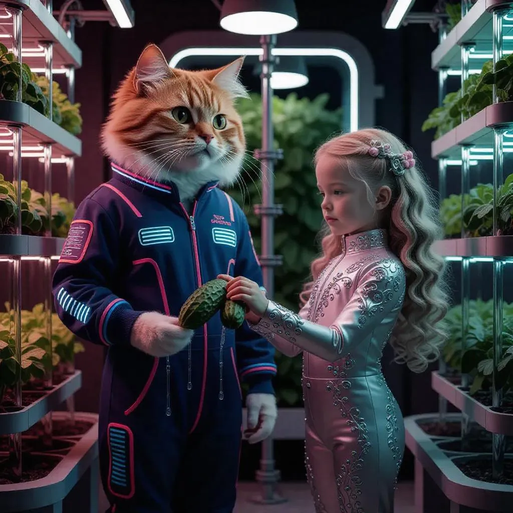 Generate a vibrant AI image of a futuristic vertical neon-lit vegetable garden, featuring an anthropomorphic ginger cat in a glowing cyberpunk jumpsuit and a blonde girl in intricate futuristic attire collaboratively tending cucumbers. Blends whimsical anthropomorphism, advanced hydroponics, and retro-futuristic aesthetics for stunning visual storytelling. Powered by Vivago.ai's professional AI image generation tools.