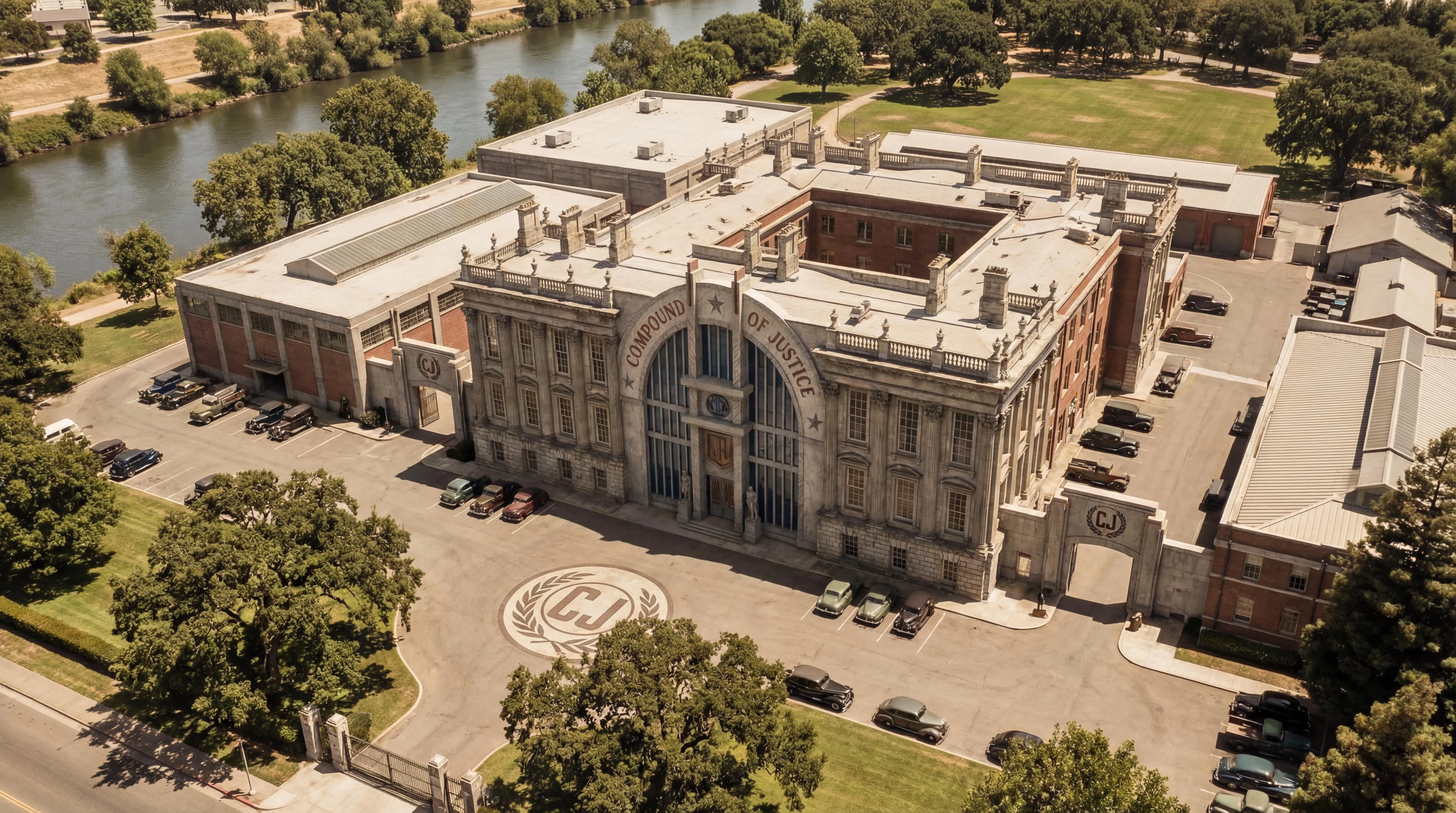 AI-generated image of the Compound of Justice, a unique architectural fusion of the Avengers Compound and Hall of Justice. Set in 1940s Oakland's Lowell Park, this logo-free superhero base blends iconic structures seamlessly. Create this distinctive crossover landmark with Vivago.ai's AI image generation.