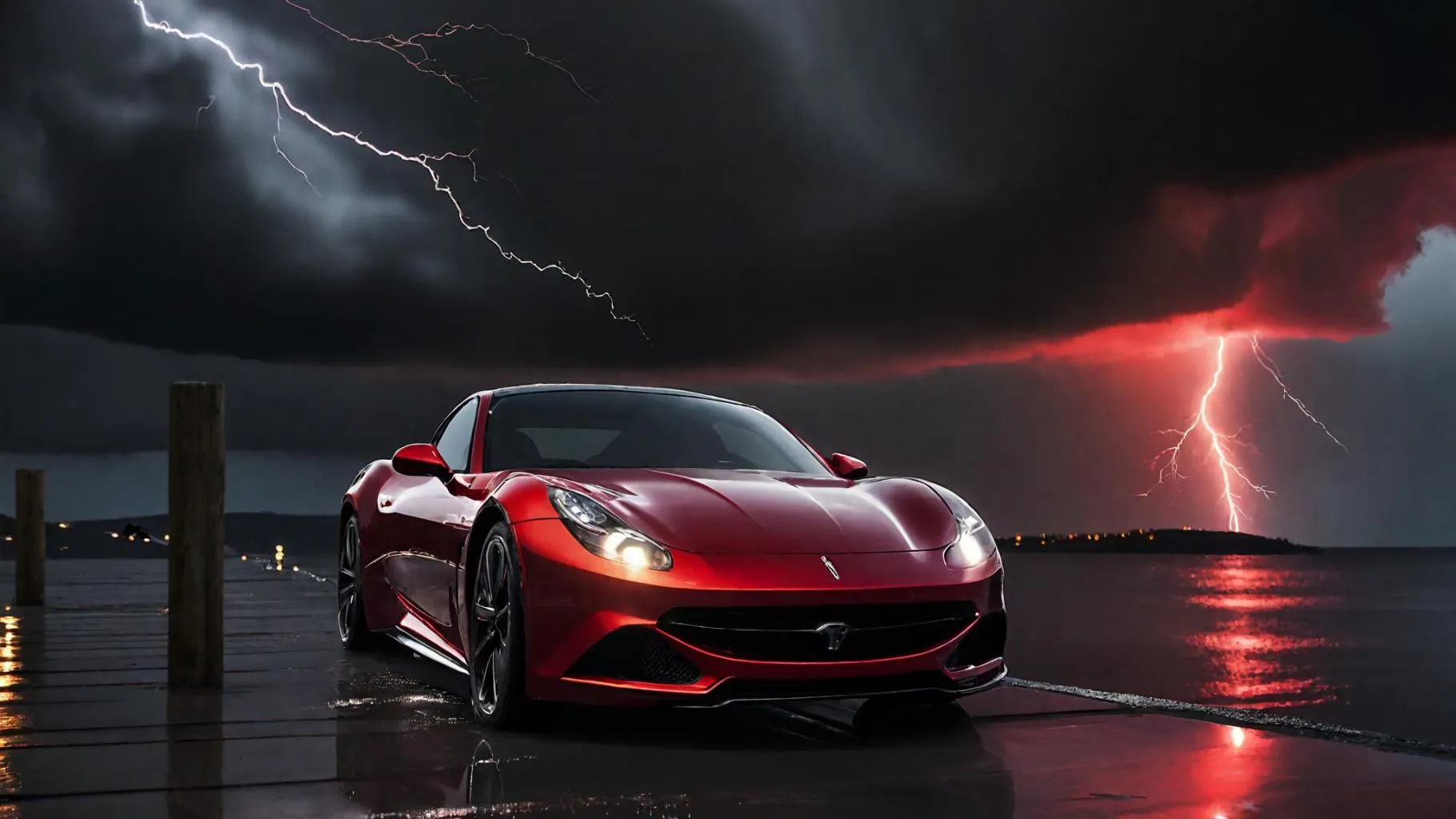 Generate a dramatic AI image of a sleek red sports car on a storm-lit pier, thunderstorm raging overhead. Headlights cut through darkness as lightning reflects on water, highlighting the car's glossy curves. Perfect for showcasing AI-powered weather effects, moody lighting, and dynamic automotive visuals in vivid, atmospheric scenes.