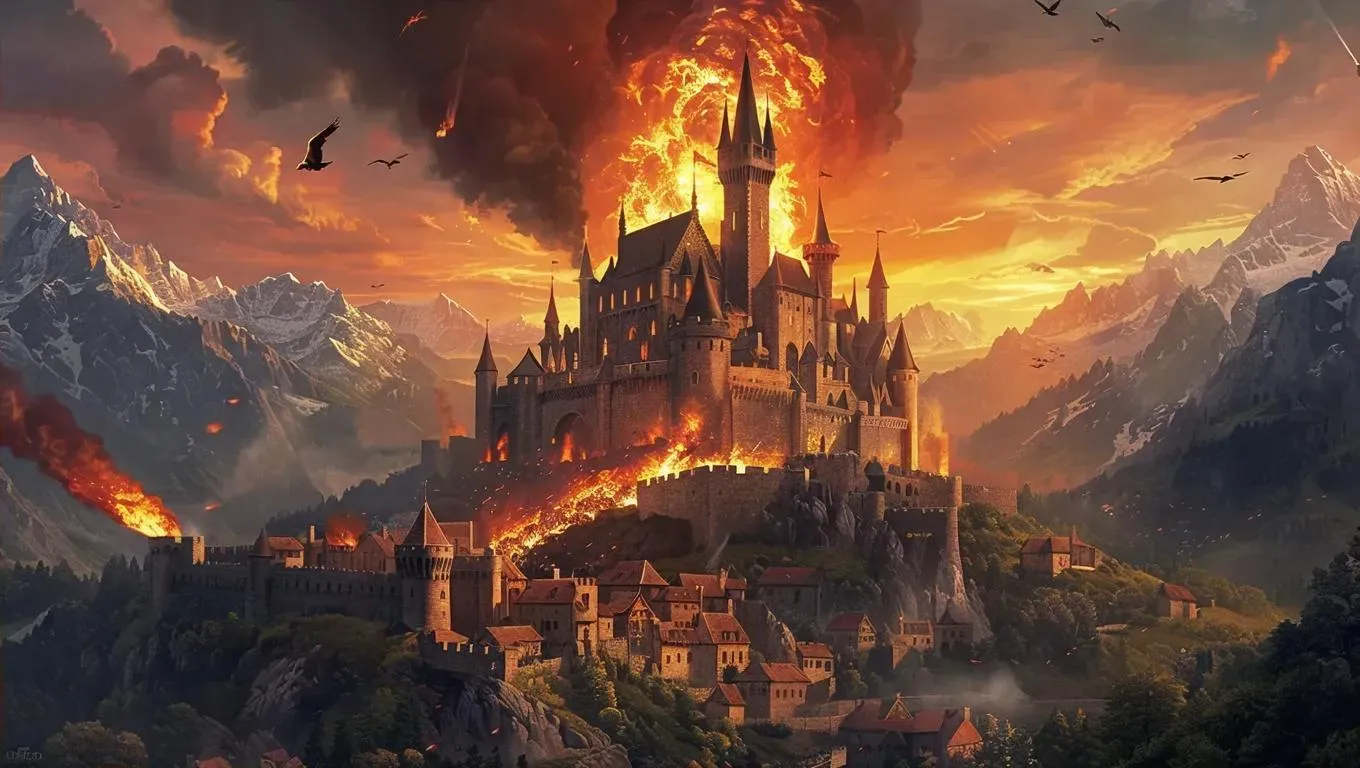 Experience AI-generated medieval warfare with Vivago.ai's dramatic battle scenes. Transform text into aerial views of a burning Gothic castle under siege, surrounded by enemies wielding cannons, rams, and steampunk ballistas. Capture towering mountain spires, chaotic villages below, and mechanized sky assaults—crafted with precision AI tools for vivid, professional-grade creative visuals.