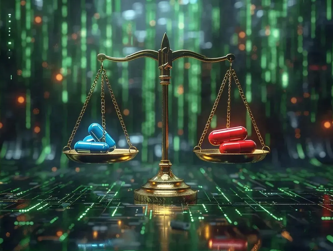 Create AI-generated Matrix-style visuals with a greenish digital backdrop, blue and red pills balancing on a scale symbolizing decisive choices. Craft cyberpunk-inspired memes or concept art using AI tools for symbolic decision-making themes. No humans, just iconic pills in a futuristic libra. Perfect for thought-provoking content with vivid AI effects and professional editing tools. Explore AI creativity at vivago.ai.