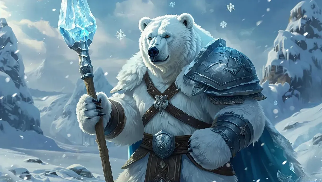 Create a fierce ice-armored warrior bear wielding a staff and shield with VivaGo AI. Generate AI-powered visuals of valiant bears in frost-ethered landscapes, glowing icy armor, and swirling snowflakes. Craft professional-grade art with determination-filled eyes and resilient details using advanced AI image tools for epic fantasy scenes and character designs.