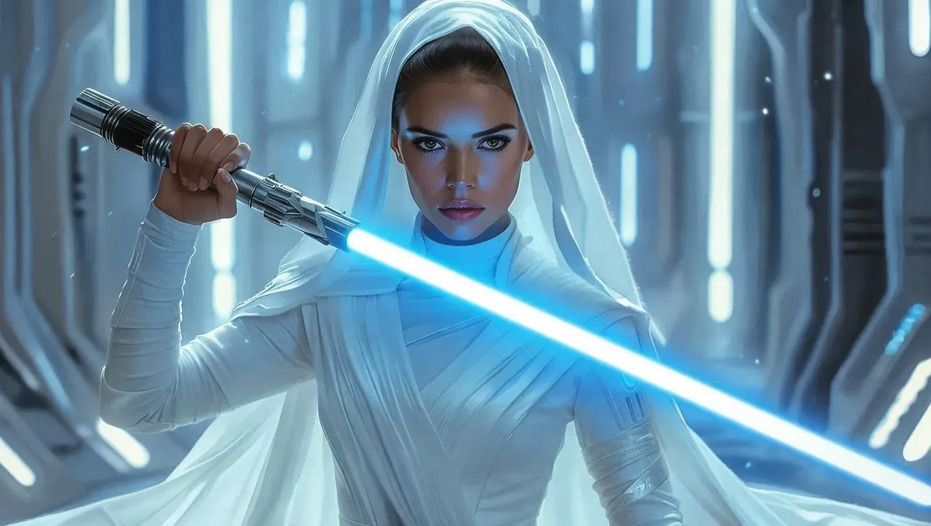 Create AI-generated art of a futuristic Jedi white princess blending sci-fi and royalty with celestial aesthetics. Vivago.ai empowers next-gen lightsaber effects, luminous armor details, and galactic elegance. Craft striking AI visuals combining Force mysticism with futuristic fashion using advanced customization and cinematic AI tools.