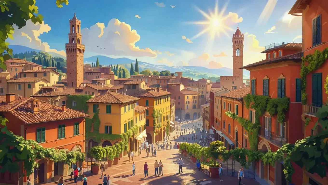 Explore a vibrant AI-generated aerial view of Lucca in cartoon style, highlighting intricate architecture and lively Italian culture under a sunny sky. Perfect for creative projects, this bustling scene blends artistic flair with detailed landscapes, ideal for animations, travel themes, or cultural storytelling.